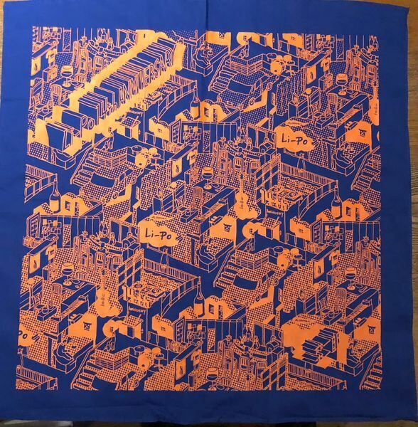 Li-Po創業14周年記念、描く建築家(通勤漫画家改メ)座二郎さん描き下ろしイラストのオリジナル・バンダナ。座二郎カラーの<ブルー×オレンジ><ピンク×ミントグリーン>に、Li-Poのテーマカラー<イエロー×ホワイト>の3色、各30枚限定での販売です。